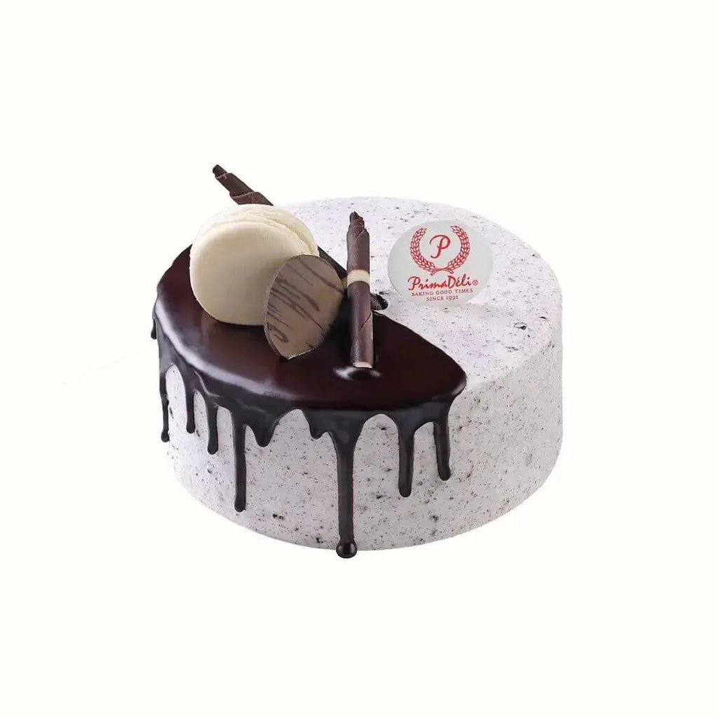 - Lusciously coated with fresh Oreo cream and rich chocolate glaze, topped with chocolate accents and a dainty macaron.